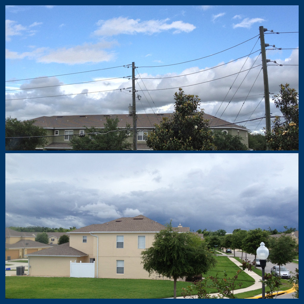A look out the bedroom window in the back of the house compared to a view out the office window in the front of the house. Taken less than a minute apart