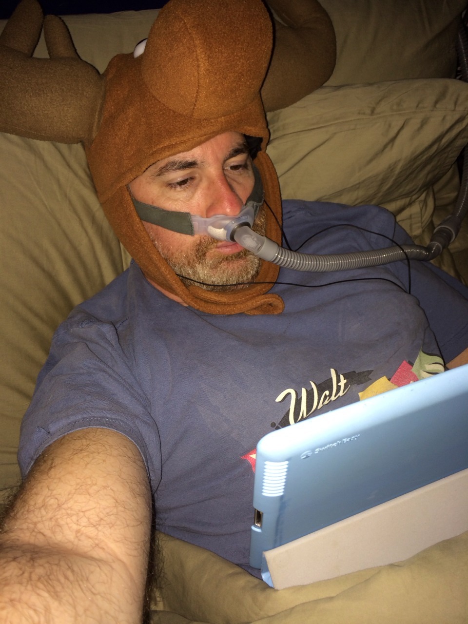 Watching RuPaul’s Drag Race in bed. Yes that’s a moose on my head. It’s high fashion couture.