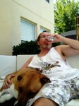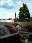 Relaxing in the yard with the hubby and our dog. Too many screaming kids at the pool.